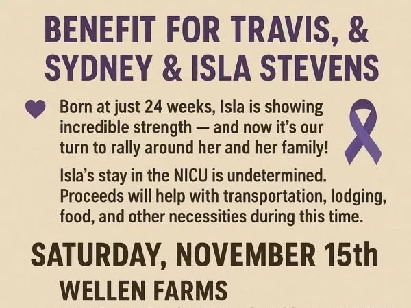 A community benefit will be held Saturday, November 15th at Wellen Farms, located at 9425 County Road 2025 North in Dahlgren, to support Travis, Sydney, and baby Isla Stevens. Born at just 24 weeks, Isla continues to show incredible strength as she remains in the NICU. Proceeds from the event will help the Stevens fami...