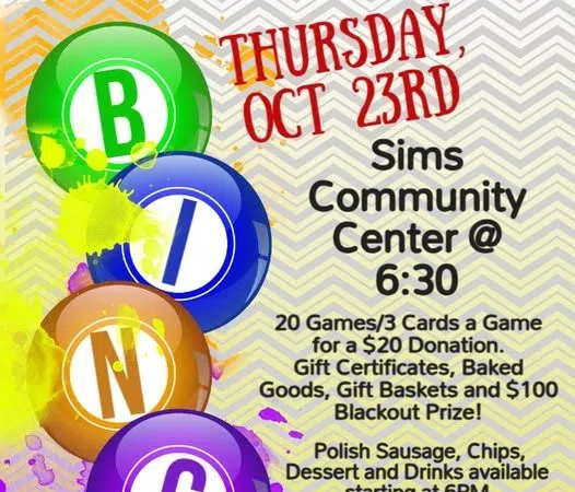 The Sims Community Center will host a Bingo Night on Thursday, October 23rd at 6:30 p.m. The evening will feature 20 games with three cards per game for a $20 donation. Players will have the chance to win gift certificates, baked goods, gift baskets, and a $100 blackout prize. Food will be available beginning at 6:00 p...