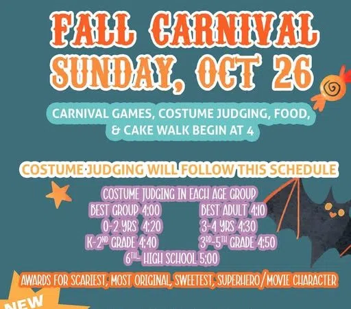 The annual Fall Carnival in Wayne City will take place on Sunday, October 26th offering an afternoon of carnival games, costume judging, trunk or treat, and more for families in the community. Festivities begin at 4 p.m., with costume judging scheduled throughout the afternoon. Judging times are divided by age groups: ...