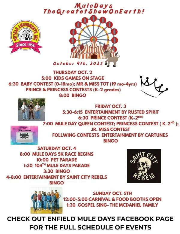 Organizers encourage everyone to check the Enfield Mule Days Facebook page for the full schedule of events.