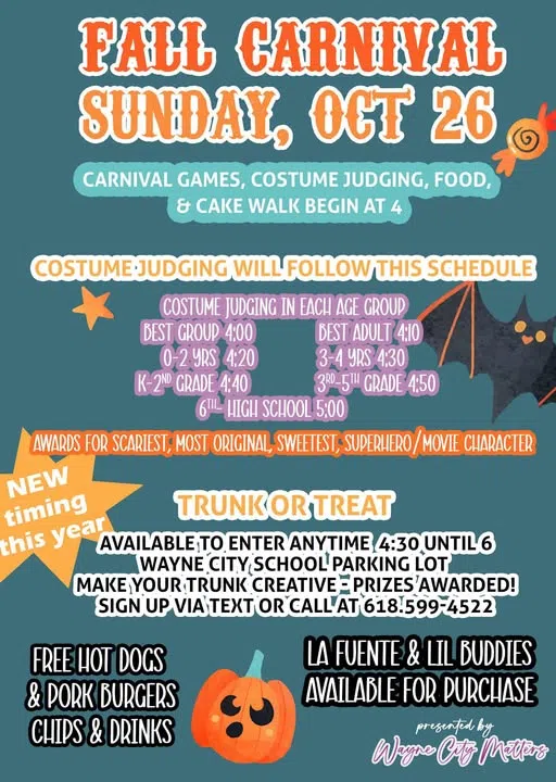 Trunk or Treat will be held in the Wayne City School parking lot, with families invited to enter anytime after 4:30 p.m. Participants are encouraged to decorate their trunks, with creative prizes awarded for the best displays. Those interested in participating can sign up via text or call at 618-599-9291.