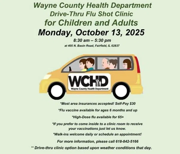 The Wayne County Health Department will host a Drive-Thru Flu Shot Clinic for both children and adults today. The clinic will be open from 8:30 a.m. to 5:30 p.m. at 405 N. Basin Road in Fairfield.