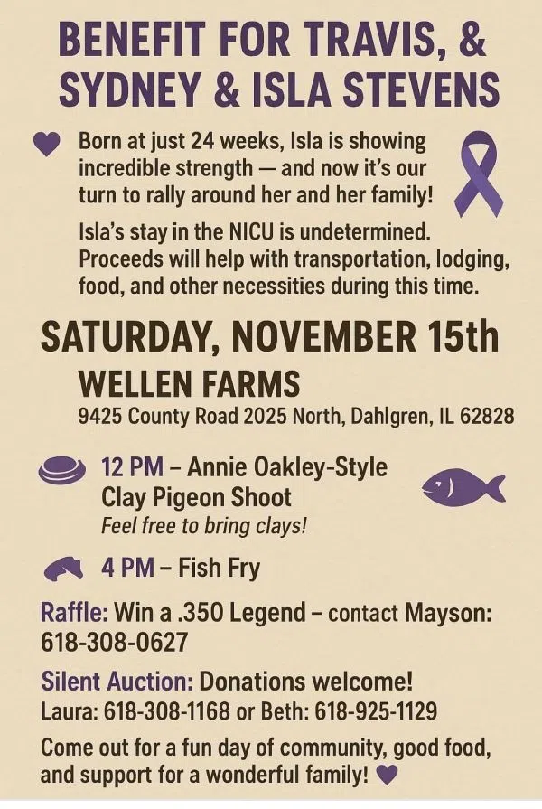 A community benefit will be held Saturday, November 15th at Wellen Farms, located at 9425 County Road 2025 North in Dahlgren, to support Travis, Sydney, and baby Isla Stevens.