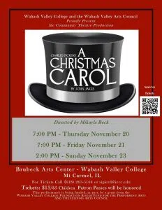 The Wabash Valley College–Wabash Valley Arts Council will present its production of A Christmas Carol on November 20th, 21st, and 23rd at the Wabash Valley College Brubeck Theatre.