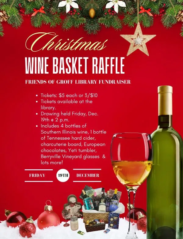 Tickets for the Friends of Groff Library Wine Basket Raffle will go on sale Saturday, November 29th, during Grayville’s Christmas parade at 6 p.m. Following the parade, tickets can be purchased at Groff Memorial Public Library in Grayville.