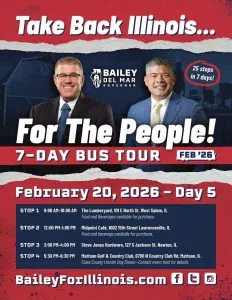 Earlier in the day, the tour will also stop at the Ponderosa Steakhouse in Vandalia, The Milk House in Greenville, and Freedom Church in Salem. Each event provides an opportunity for residents to meet the candidates, ask questions, share concerns, and hear directly about Bailey’s vision for Illinois.