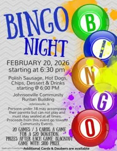 The Johnsonville Community Ruritan Club will host a Bingo Night fundraiser on Friday, February 20th with games starting at 6:30 p.m. The event will take place at the Johnsonville Community Ruritan Building, with food service—including Polish sausage, hot dogs, chips, dessert, and drinks—beginning at 6:00 p.m.