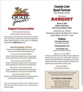 Conservation supporters and community members are invited to the 5th Annual County Line Quail Forever Banquet, benefiting Clay and Wayne Counties. The event will take place on Saturday, March 21st at the Willow Creek Venue, located at 236 U.S. Highway 45 South of Fairfield. The evening will kick off with a social hour from 4:30pm-5:30pm and a Fish Dinner by McPeak Fish Market from 5:45 to 6:45 p.m.