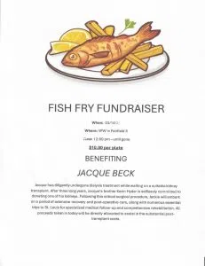 A Fish Fry Fundraiser will be held on Saturday, March 14th at the Fairfield VFW on East Court St. in to support Jacque Beck, who is undergoing dialysis treatment while awaiting a kidney transplant. The event will begin at 12:00 p.m. and continue until all meals are gone.