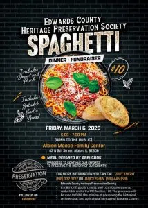 The Edwards County Heritage Preservation Society will host a spaghetti dinner fundraiser on Friday, March 6th from 5:00 to 7:00 p.m. at the Albion Moose Family Center, 43 N. 5th Street in Albion.