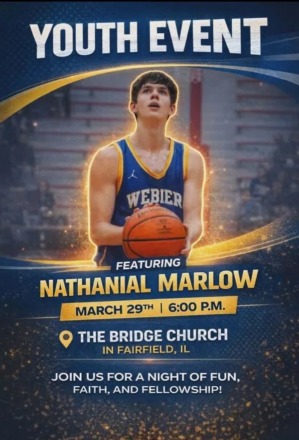 Area communities and youth are encouraged to attend a special worship event to be held on Sunday, March 29th at 6pm at The Bridge Church, located on IL Hwy 15 west of Fairfield. Webber High School Senior, Nathaniel Marlow will be the featured speaker.