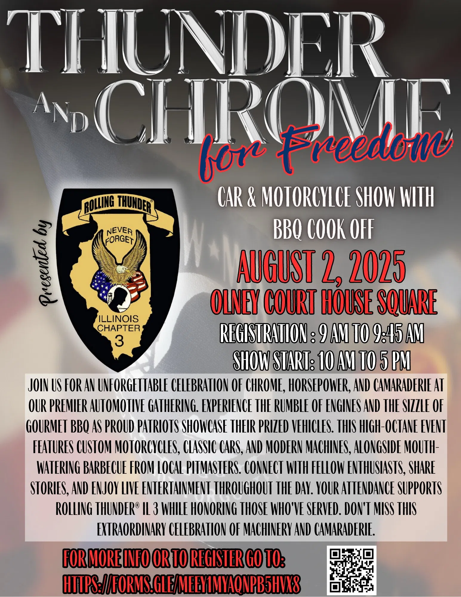 Motorcycle and car enthusiasts are invited to rev their engines for a cause at the "Thunder and Chrome for Freedom" Car & Motorcycle Show and BBQ Cook-Off on Saturday, August 2nd at the Olney Cour...
