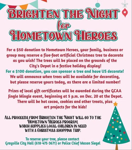 Grayville's annual "Brighten the Night for Hometown Heroes" event is underway, giving families, businesses, and organizations a chance to support local children while spreading holiday cheer. For a $5...