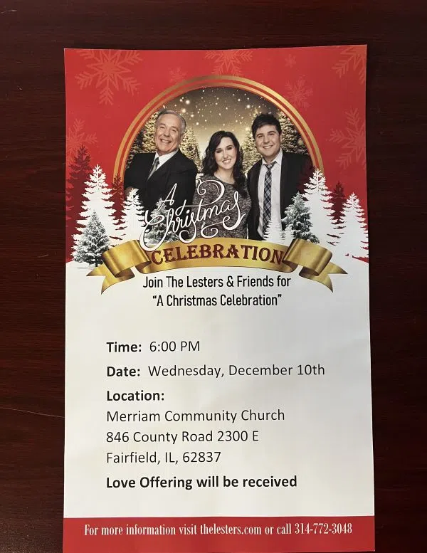The Merriam Community Church will present on Wednesday, December 10th, The Lesters & Friends, "A Christmas Celebration." The event is set to begin at 6:00 PM at 846 County Road 2300 E. northeast o...