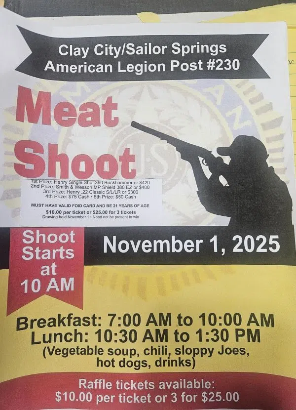 The Clay City/Sailor Springs American Legion Post #230 will host its annual Meat Shoot on Saturday, November 1st. The shoot begins at 10 a.m., but the day kicks off early with breakfast served from 7 ...