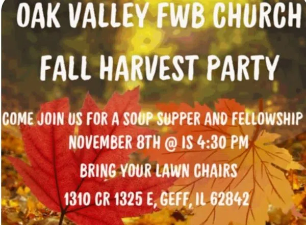 Oak Valley Free Will Baptist Church will hold its annual Fall Harvest Party, set for Saturday, November 8th at 4:30 PM. The event will be held at 1310 County Road 1325 East in Geff. Guests are encoura...