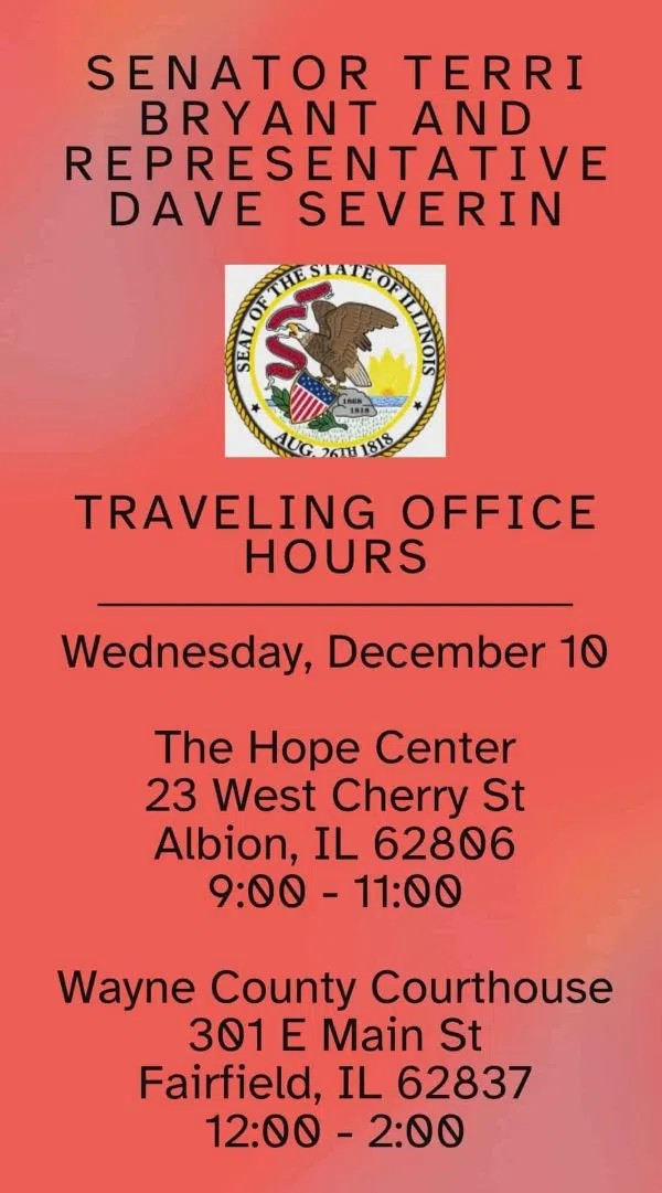 Senator Terri Bryant and State Representative Dave Severin will be holding traveling office hours on Wednesday, December 10th, to assist constituents with state-related questions and services. The leg...