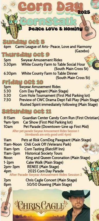 The Carmi Chamber of Commerce has announced the schedule for Corn Day 2025, with events set for Thursday, October 9th through Saturday, October 11th. This year's theme is "Cornstalk: Peace, Love &...