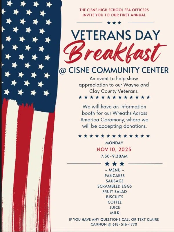 The Cisne High School FFA Officers will host their first annual Veterans Day Breakfast on Monday, November 10th at the Cisne Community Center. The event will take place from 7:30 to 9:30 a.m. and is d...