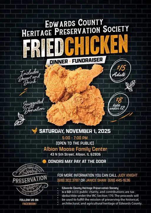 The Edwards County Heritage Preservation Society will hold a Fried Chicken Dinner Fundraiser on Saturday, November 1st from 5 to 7 p.m. at the Albion Moose Family Center, located at 43 N. 5th Street i...