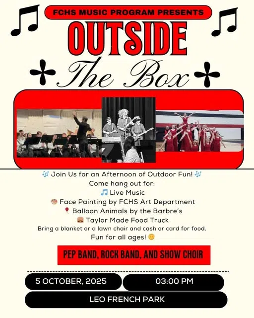 The Fairfield Community High School (FCHS) Music Program is set to host an outdoor event, "Outside the Box," at Leo French Park on Sunday, October 5th starting at 3:00 PM. The afternoon promises an ar...