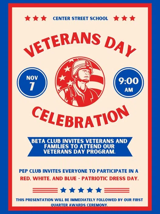 Center Street School is set to honor local heroes with a special Veterans Day Celebration today (Friday), beginning at 9:00 AM. The event, organized by the school's Beta Club, invites veterans and the...